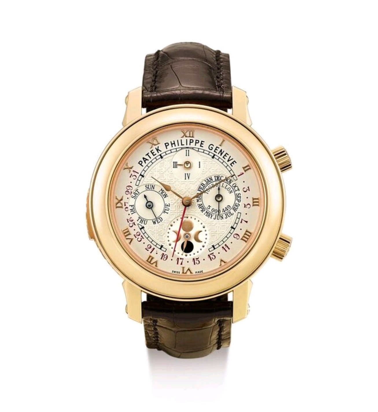 Jam model ini diluncurkan oleh Patek Philippe pada tahun 2001 dan specimen yang terjual ini dibuat pada tahun 2011, diantara 12 complications yang dimiliki model ini dilengkapi dengan dua complications rumit yaitu sebuah minute repeater dengan gong katedral dan sebuah tourbillon. Pada dial depan, jam ini menampilkan waktu dan sebuah perpetual calendar dengan retrograde date dan indicator moon phase yang indah.