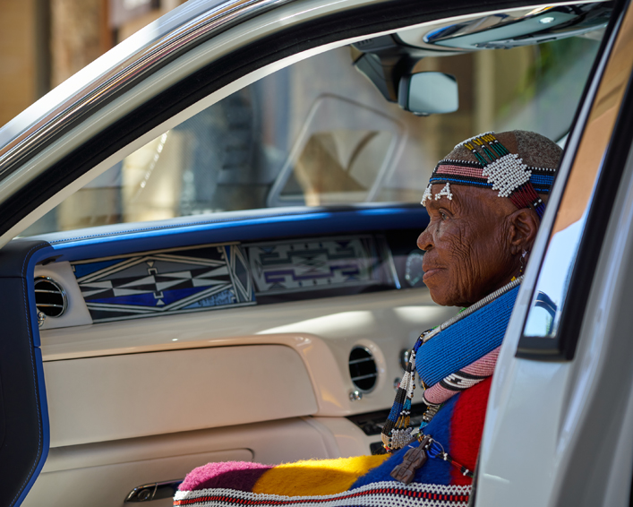 Diposisikan di depan dan di tengah interior Phantom, komisi unik ini merupakan ekspresi seni Afrika kontemporer yang mencolok. Terkenal dengan lukisan dan mural abstrak geometris yang semarak, karya berusia 85 tahun ini dapat ditemukan di banyak museum penting dan koleksi pribadi di seluruh dunia. Untuk merayakan komisi unik ini, Rolls-Royce juga memproduksi film berwawasan untuk memamerkan karya Esther Mahlangu dan warisan budaya.
