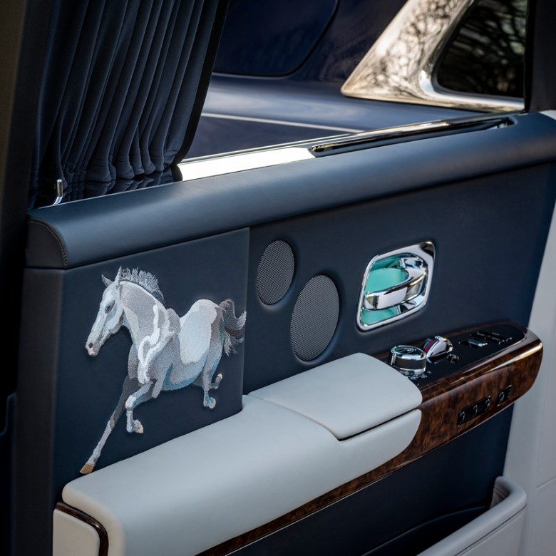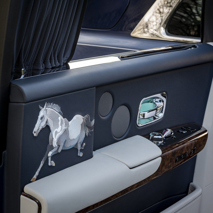 Sulaman Bespoke yang rumit dari seekor kuda jantan menghiasi pintu belakang interior Phantom Extended yang elegan ini.
