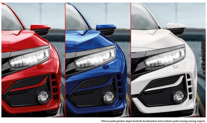 New Honda Civic Type R tersedia dalam 3 pilihan warna yaitu Rallye Red, Brilliant Sporty Blue Metallic, dan Championship White. Mobil ini ditawarkan dengan harga Rp 1,177,000,000,- (harga yang tertera adalah harga on the road wilayah Jakarta untuk kepemilikan orang pertama tahun 2021).